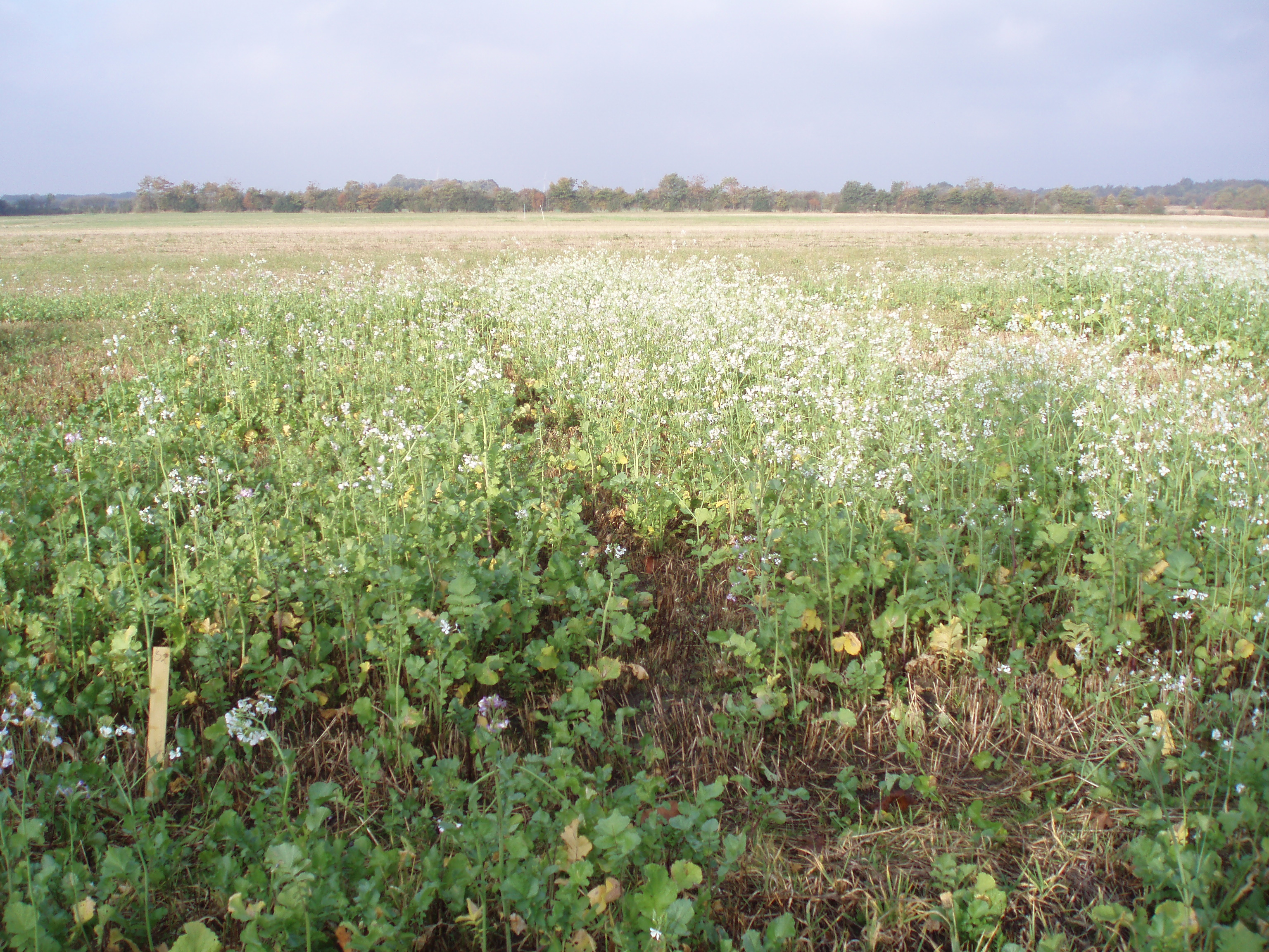 Desuden er der efterafgrødeblandinger der er spredt enten kort før høst eller efter høst og efterfølgende striglet. Disse to er kombineret med (og uden) 20 kg N, så effekten af næringsstoffer kan ses.