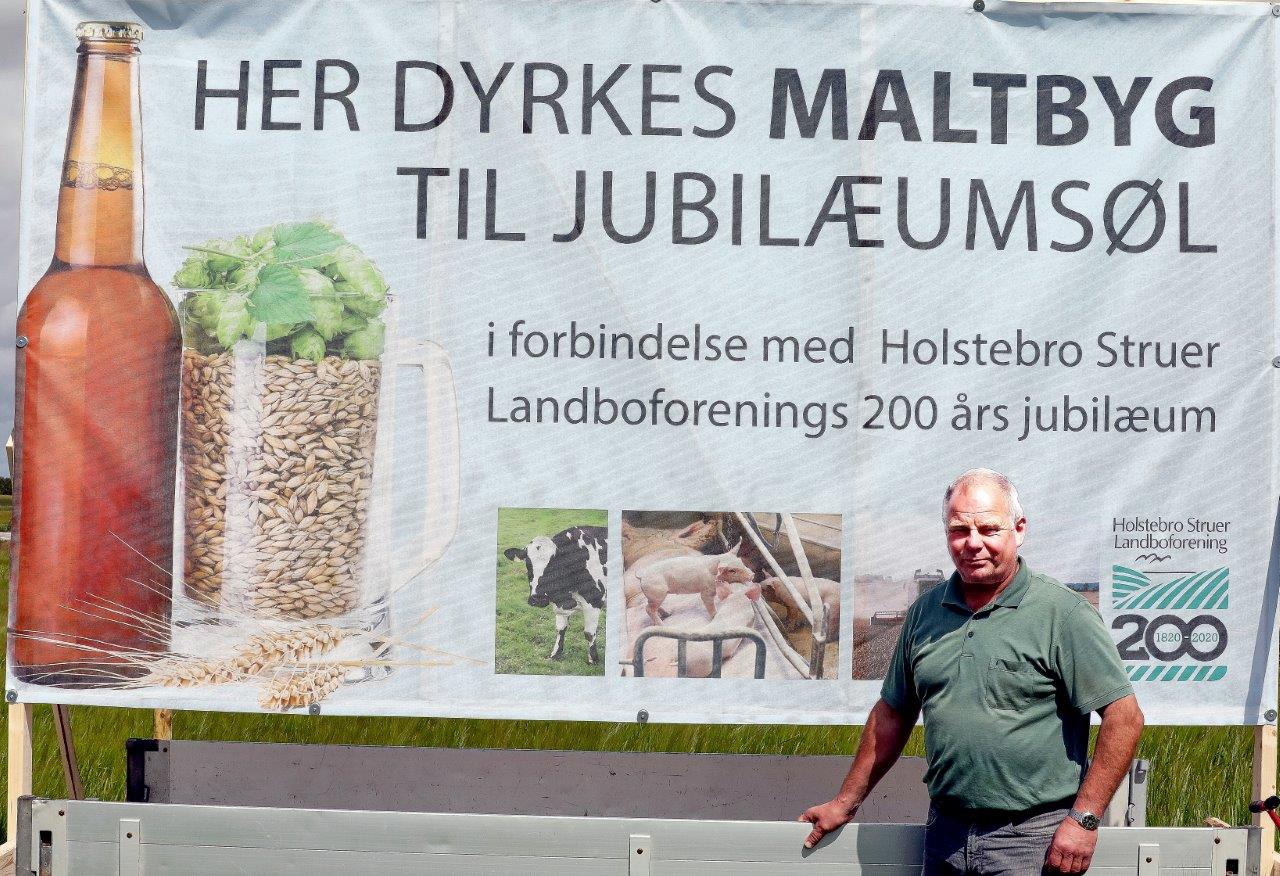 Formand Kristian Gade ved banneret på en mark med maltbyg, der tænkes brugt i produktionen af en jubilæumsøl i forbindelse med 200-året for Holstebro Struer Landboforening. Foto: SAGRO