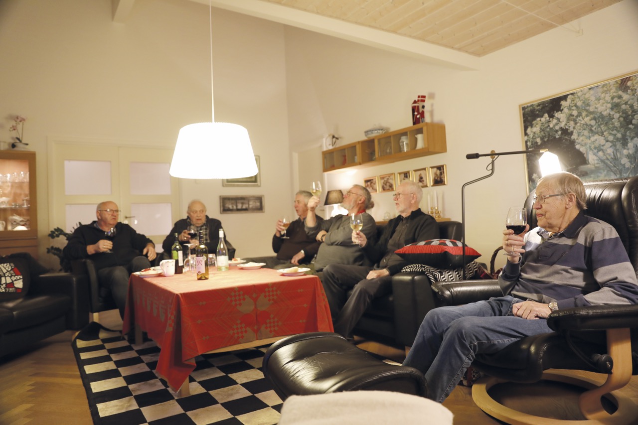 Dagens dagsorden står på et hurtigt besøg i stalden hos Hedebo I/S, som Peder Philipp, der er yngste medlem af gruppen, netop har gennemført et generationsskifte på. Han har dog stadig sim daglige gang på gården som “frivilligt arbejdende pensionist”, som han kalder det. Efter besigtigelsen står den på kaffe og hjemmebagte boller, hvorefter de bløde møbler lokker med et glas rødvin.