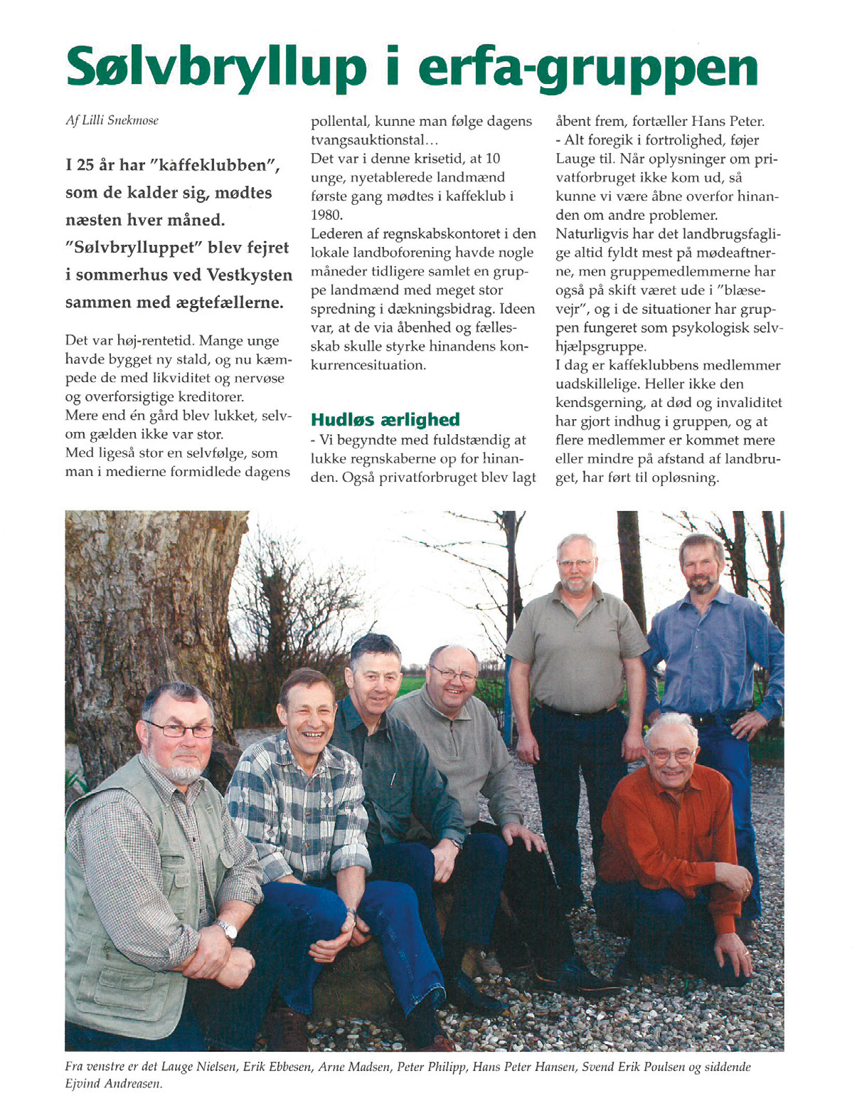 I mere end 40 år har syv landmænd mødtes næsten hver måned. De første mange år var dagsordenen hårdt funderet i optimering og udvikling af hver deres landbrug. Det udviklede sig til venskaber, og i dag mødes erfa-gruppen stadig for at vende verdenssituationen.
