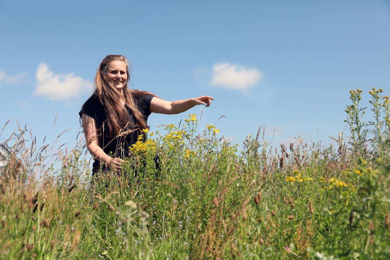 En dejlig og helt naturlig grøftekant rummer masser af spændende planter og summer af insektliv, herunder den sommerfugl, som Lisbeth Gliese peger på.
