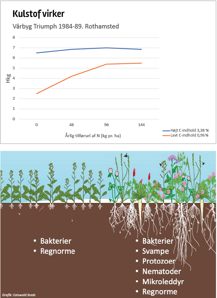 En mark med lavt kulstofindhold vil ikke kunne præstere så højt et udbytte, som en mark med højt kulstofindhold. Heller ikke, selvom marken med lavt kulstofindhold bliver fuldgødet. Kulstoffet gør forskellen. Økologerne siger derfor, at du skal gøde jorden, ikke planterne. Kulstoffet kan binde næringsstofferne og frigive dem til planterne på det rigtige tidspunkt.