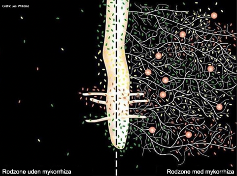 Des flere svampe du har i jorden, desto mere får du ud af tilført gødning. Det skyldes at svampenes hyfer transporterer næringsstoffer til rodhårene fra en langt større omkreds end bakterierne, der alene arbejder 1-2 mm fra rodhårene.
