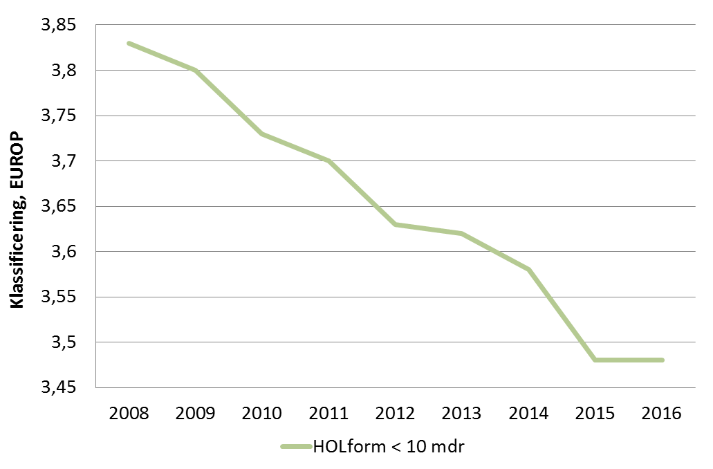 Figur 1. Udviklingen i klassificeringen på Holstein tyrekalve, slagtet ved en alder under 10 måneder. Kilde: Slagtekalvestatistikken.dk