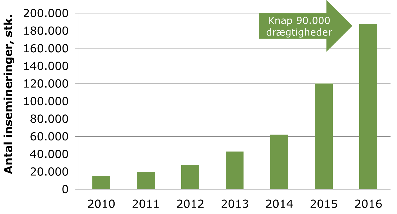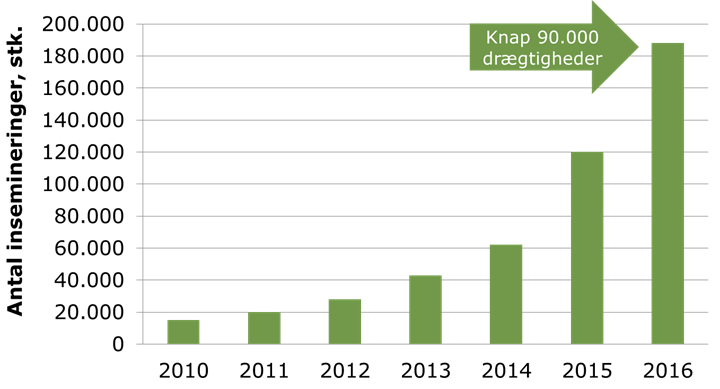 Og antallet af insemineringer med kødkvæg er rigtigt nok vokset. I 2011 blev 20.000 malkekøer insemineret med kødkvægssæd – i 2016 var tallet eksploderet til 180.000 insemineringer. Vi kan i løbet af 2017 få omkring 50.000 krydsningskalve til opfedning.