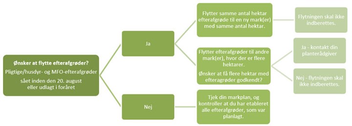 Har du fulgt planen, som blev lagt inden sæsonen, behøver du selvfølgelig ikke at foretage dig noget. Har du derimod ændret arealet eller flyttet efterafgrøder til andre marker, end de er anmeldt i, skal du i en række tilfælde indberette ændringen. Figuren herunder giver overblik over de fleste situationer.