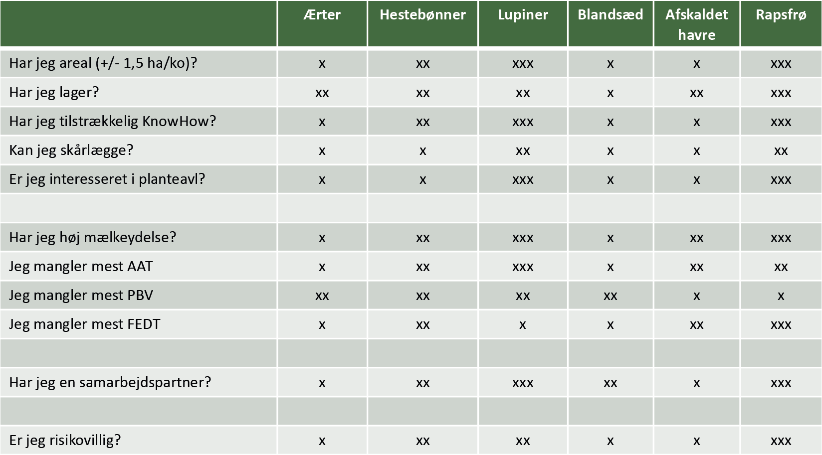 Som det første bør man gøre sig nogle strategiske overvejelser som landmand. Se tabel 1. Hvor ligger din faglighed? Vil du helst passe dyrene eller markerne? Har du jord nok? Kan du lagre afgrøderne? Hvad har du sværest ved at opfylde i din foderplan? Har du en samarbejdspartner? Er du risikovillig? Dette er blot eksempler på vigtige spørgsmål, man bør stille sig selv inden, at man hopper ud i faglige detaljer, såsom sædskifte, gødskning, ukrudtsbekæmpelse, forarbejdning osv. Ellers risikerer man en meget negativ oplevelse. F.eks. vil dyrkning af lupiner og raps stille krav til ukrudtskontrol og gødskning, hvilket i sidste ende handler om, at man får gjort tingene på de rigtige tidspunkter. Omvendt vil blandsæd eller afskallet havre for mange være langt lettere dyrkningsmæssigt/fagligt at håndtere, men foderværdien er selvfølgelig ikke den samme som de mere krævende afgrøder. Man bør derfor som landmand og rådgiver være indstillet på en åben og ærlig samtale om, hvad man kan og bør. Det skal både rådgiver og landmand have mod til!