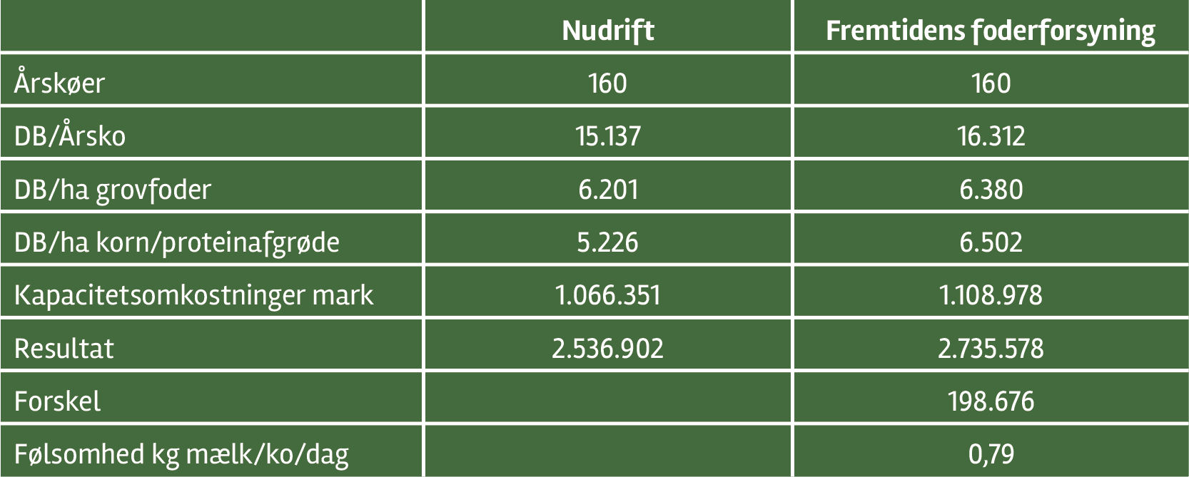 I beregningerne er der tale om en jersey-besætning på 160 årskøer med opdræt og 170 ha jord. Der er derfor fortsat behov for indkøb af fodermidler på bedriften, da arealet er for småt til selvforsyning. Modellen viser en forskel på 198.676 kr./år i resultatet. Det er vigtigt at have kendskab til følsomheden i beregningerne. Den ændrede strategi går i nul, hvis ydelsen falder med 0,79 kg/mælk/dag/ko.