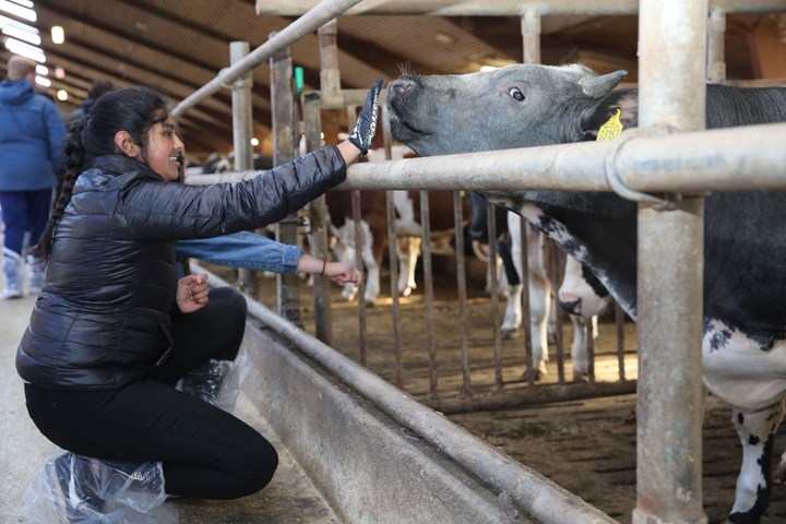 De omkring 30 elever var på en halvanden times rundvisning i staldene, hvor de så på kalve og større kvæg, mens fodervogne og traktorer var i gang med fodringen.