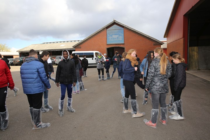 På Kjargården tog driftsleder Lasse Mølby og fodermester Maria Boe imod og fik eleverne monteret med de obligatoriske og knitrende plastikfutter.