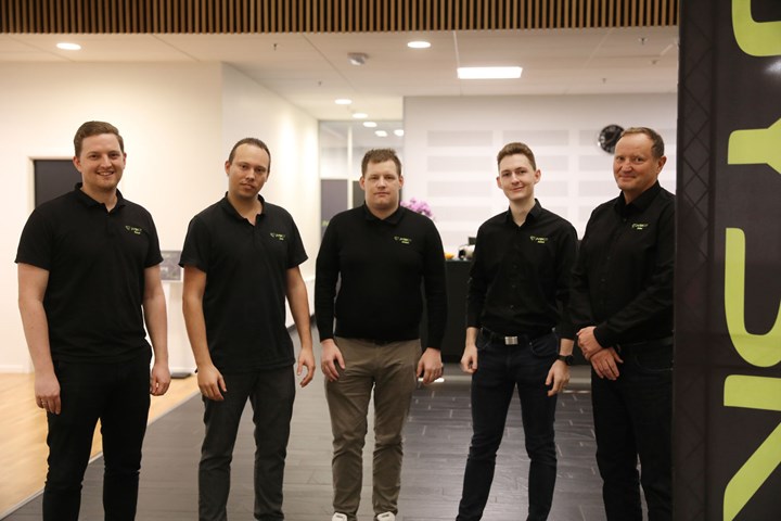 En ledergruppe med unge, der alle er under 30 skal løfte opgaven med at videreføre Jysk IT, der servicerer en række brancher som landbrug, landbrugsrådgivninger, maskinstationer, dyrlæger, og tandlæger. Fra venstre Simon Husballe, Jess Juul Ellegaard, Jesper Smedegaard, Anton Broch og afgående direktør Peter V. Tomsen Foto: SAGRO