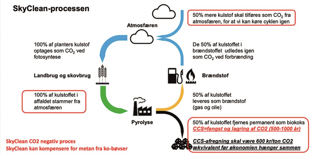 SkyClean kalder Stiesdal systemet, der binder mere kulstof, end der udledes ved at bruge de øvrige produkter i systemet til brændstof eller for eksempel produktion af plastic. Med andre ord: Landbrugets spildprodukter kan bruges til at rense atmosfæren for CO2.