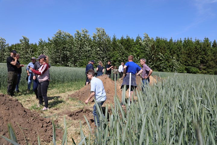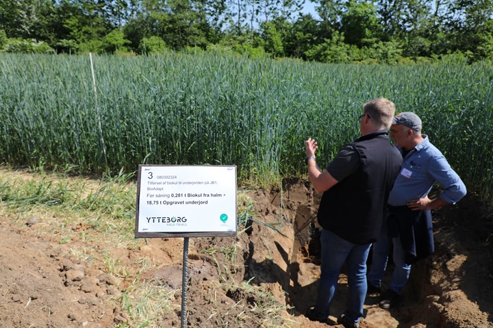 I parceller på fem gange fem meter er der blevet nedbragt forskellige mængder biokul, og gæsterne kunne ved selvsyn konstatere forskelle i jordlag, i jordstrukturen, i rodudviklingen og i væksten. Der blev diskuteret, kommenteret og studeret til den store guldmedalje af de interesserede deltagere, mens Janne Aalborg Nielsen fra SEGES guidede dem gennem forsøgets faser og forløb.