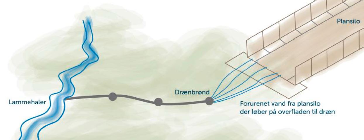 To af forureningerne skyldtes, at afløbene ved plansiloerne var tildækkede med ensilage, så forurenet overfladevand fra plansiloerne i stedet løb i et afløb nær ved plansiloerne og til dræn og vandløb.