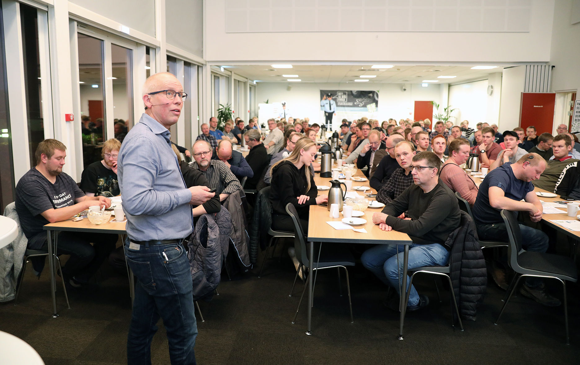 Mads Jacobsen og Nicklas Damgaard fra Holstebro-området var begge kommet til aftenen for at høre lidt om sikkerheden, der er en del af deres hverdag. Mads havde selv mistet sin far efter et fald fra 2,5 meter fra et tag, så han kender allerede til alvoren. Begge erkendte dog, at de selv stadig arbejder på måder, der er risikable – alt fra at stå på stiger til at forsøge at trække et køretøj fri, hvor kæden pludselig smadrer ind gennem førerhuset.