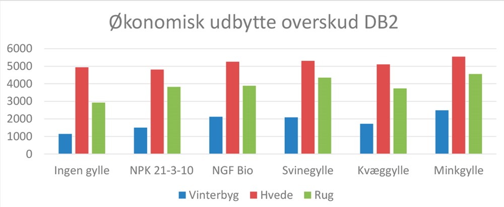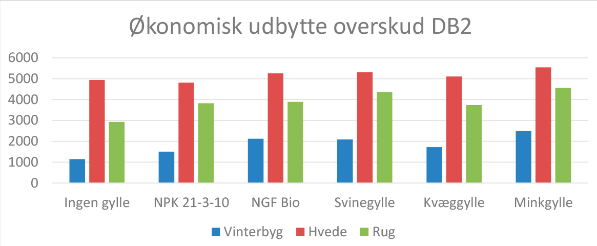 Forsøget ligger i en velgødet jord med et højt indhold af næringsstoffer og organisk materiale, hvilket også kommer til udtryk i forsøgsresultaterne. F.eks. i led nr. 1, hvor der ingen tilførsel af gylle eller NPK-gødning har været, blev kerneudbyttet alligevel tilfredsstillende, selvom det endte noget lavere end de øvrige fem led. Den primære årsag er jordens gode næringsstoftilstand. Til gengæld var omkostningerne i led 1 også holdt på et minimum, da der kun var kørt en smule kvælstofgødning ud i foråret. I hveden gav dette led et økonomisk udbytte på knap 5.000 kr. pr. ha (DB2), og holdt op imod de led, der fik tilført gylle, kastede disse led mellem 0-500 kr. mere af sig. Se diagram.