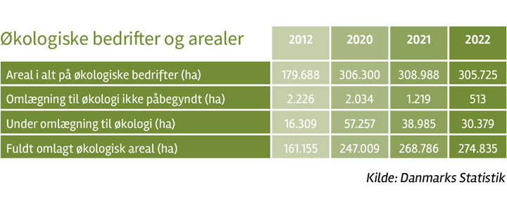 Svaret er kort sagt: Den gale vej. 31. maj 2022 var der 1,3 % færre økoligiske bedrifter i Danmark, eller 56 i absolutte tal, hvis man sammenligner med året før. I alt er der nu 4.095 bedrifter, der er certificerede eller har søgt om certificering til økologisk jordbrugsproduktion. Det viser rapporten ”Statistik over økologiske jordbrugsbedrifter 2022”, som er udgivet af Landbrugsstyrelsen for Ministeriet for Fødevarer, Landbrug og Fiskeri.