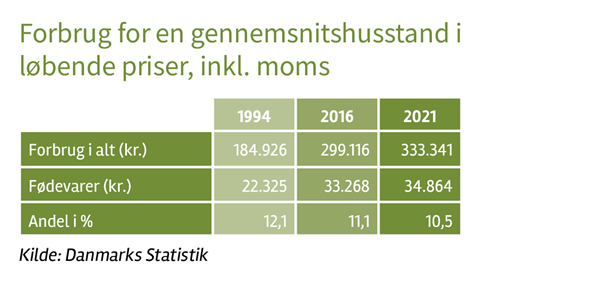 Reelt set er danskernes udgifter til fødevarer også faldet konsekvent gennem de sidste mange år (se tabel). I 1994 udgjorde fødevareudgifter 12 % af samtlige udgifter i en gennemsnitlig husstand. I 2021 var det 10 %. Begge tal er udregnet i løbende priser og inkl. moms.