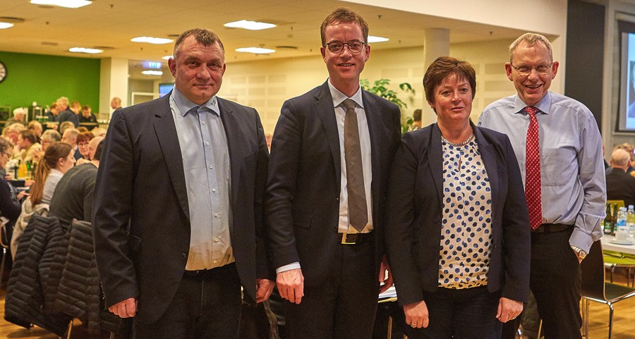 4 (andre) store på stribe! Fra venstre Bjarne Larsen, formand for Jysk Landbrug, fødevareminister Esben Lunde Larsen, Anni Matthiesen (MF) og Martin Merrild.