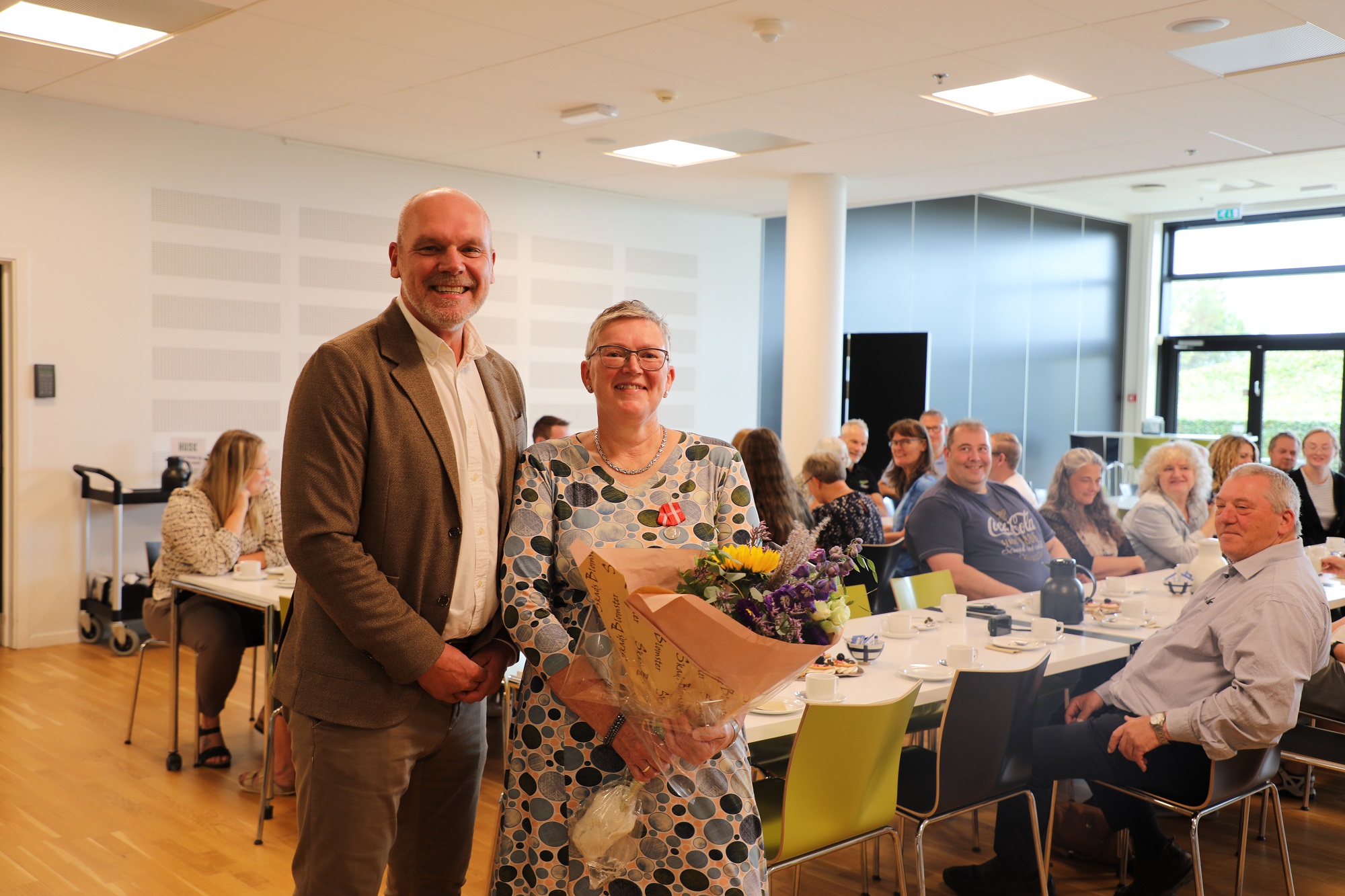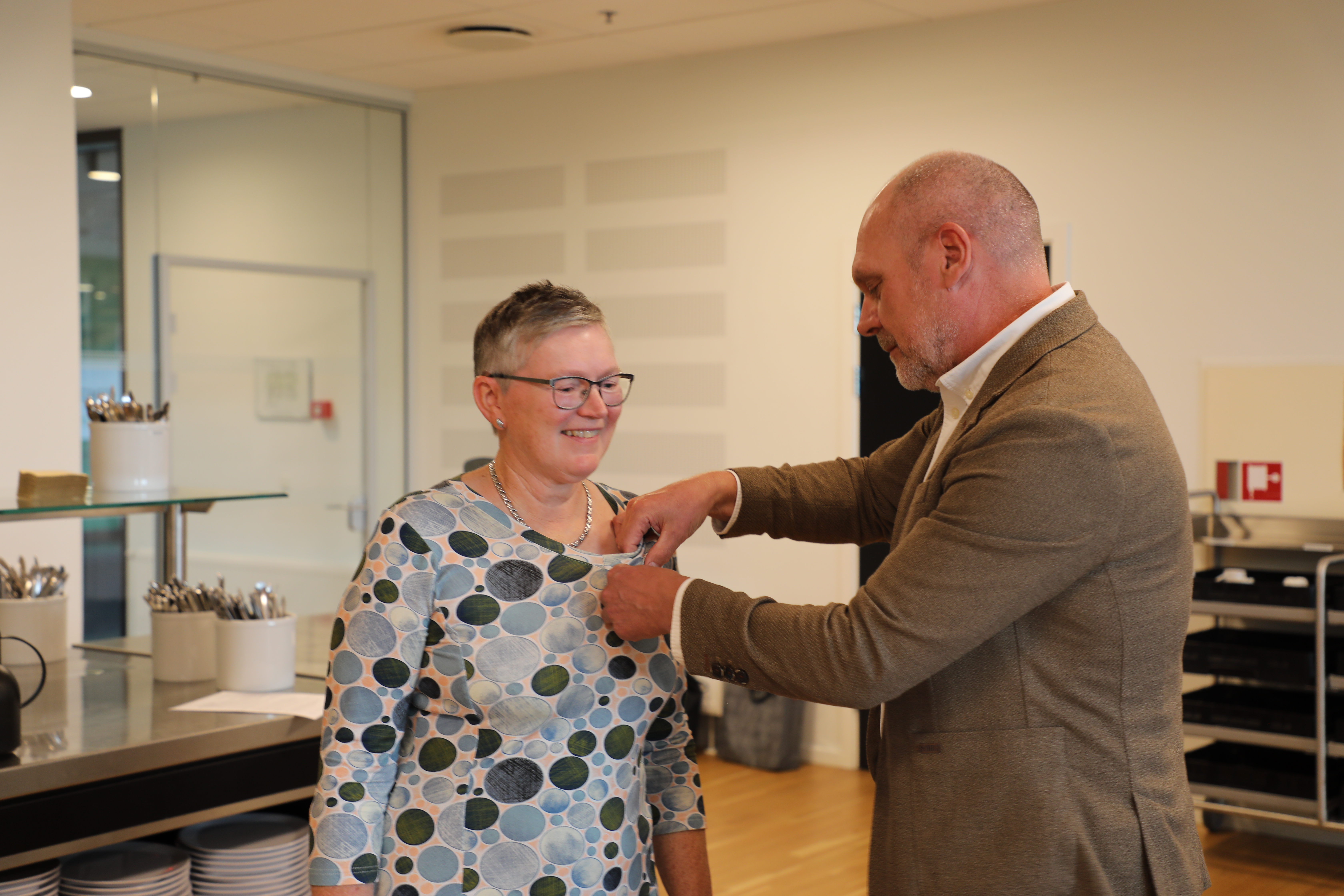 Kirsten Gorm Pedersen er blevet tildelt Den Kongelige Belønningsmedalje efter 43 års ansættelse i SAGRO. Det blev markeret ved en reception, hvor adm. direktør Torben Jensen overrakte hende den flotte medalje.