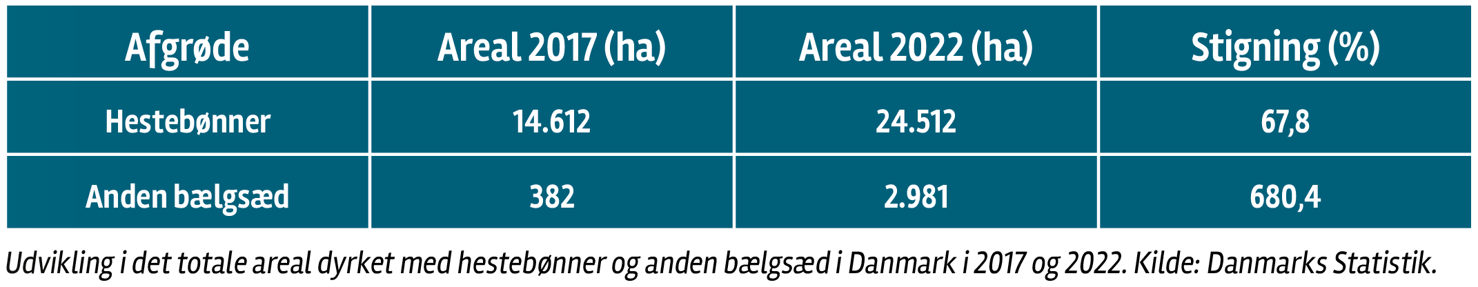 Jakob Kristensen er ikke den eneste, der har vendt sig mod proteinafgrøder. Tal fra Landbrugsstyrelsen viser, at det totale areal med hestebønner er vokset med hele 68 % i forhold til 2017-niveau. Endnu mere voldsomt ser det ud for “anden bælgsæd”, hvor der er registreret en vækst på 680 % i samme periode.