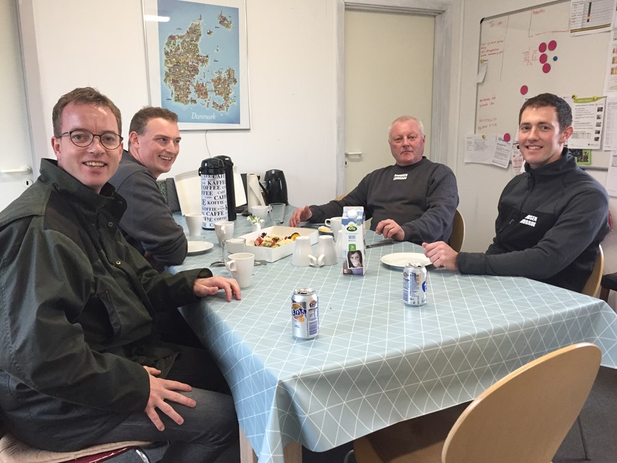 Snak over køkkenbordet mellem Esben Lunde Larsen, driftsleder Anders og Per og Kent Davidsen.