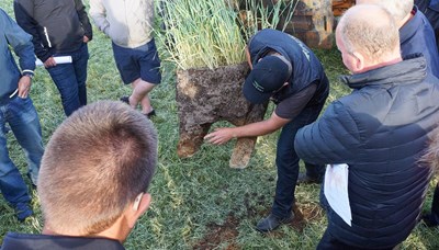 Palleløfteren gravede ned og vippede en jordprofil op, så det blev tydeligt at se, hvor dybt der var harvet, hvor jorden var pakket - og ikke mindst hvordan rodudviklingen var. Som kabelbundter fulgte rødderne ormegangene ned til næring og vand.
