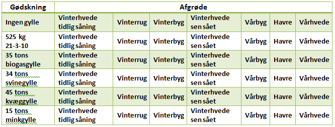I gødningsforsøget er følgende afgrøder repræsenteret: Vinterhvede, vinterrug og vinterbyg samt vårbyg, havre og vårhvede. Vårsæden er sået efter udbringning af gyllen og der er i alle led placeret NS 21-24 ved såning. Desuden har vi suppleret op med handelsgødning så alle afgrøder er gødet op til optimalt gødningsniveau, en af behandlingerne er dog ugødet og en anden er kun gødet med NPK gødning og har ikke fået gylle.