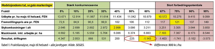 Fraktilanalysen er visuel stærk, giver et godt overblik og er god at bruge til udpegning af indsatsområder. Her viser de gule markeringer, hvor landmanden ligger i sin majsproduktion. Og det giver mulighed for at udpege områder, hvor han vil gøre en indsats. Det vil give god mening at arbejde med udbyttet og med maskinomkostninger. Begge ligger i ”det røde felt”, så her er der plads til forbedring. Tabel 1 viser også, at der er 900 kr./ha at hente, når det lykkes at opnå et resultat på niveau med gennemsnittet.