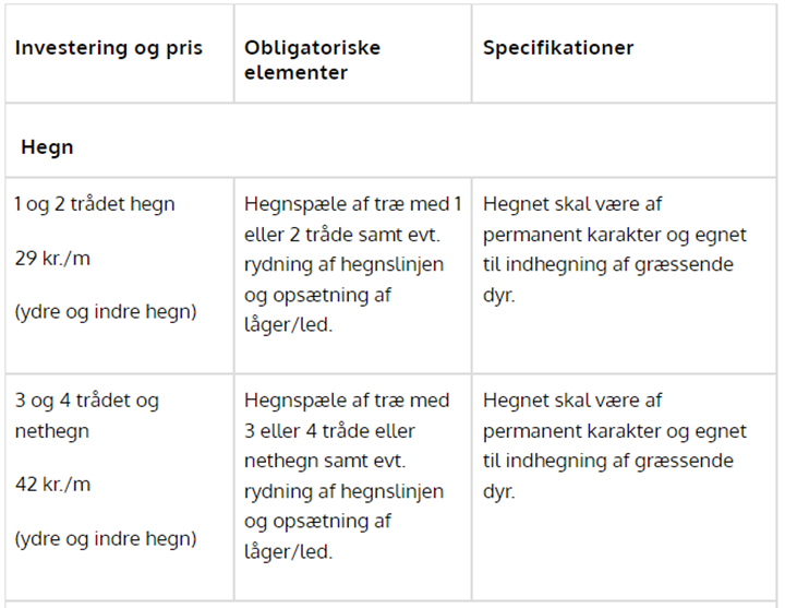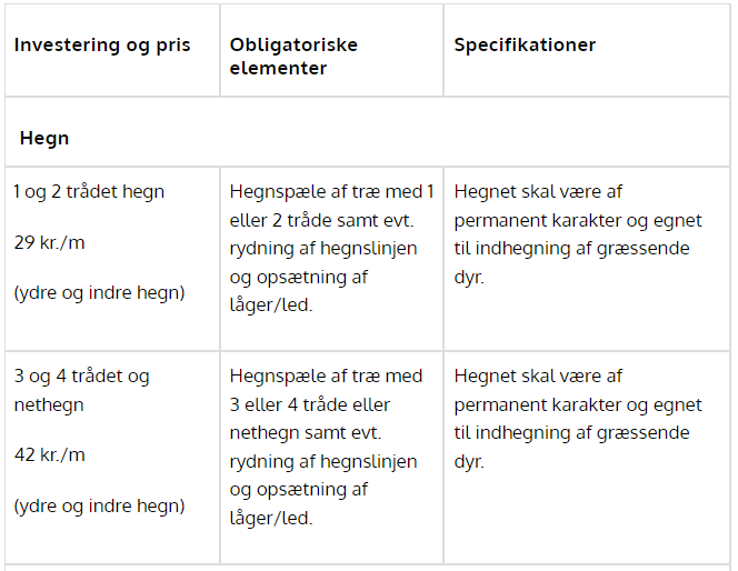 De enkelte tilskud centreret omkring hegning, kan du se i tabellen herunder. Øvrige tilskud ifbm. drikkevandsforsyning, fast fangefold, elforsyning og kreaturovergang kan finde hos Landbrugsstyrelsen på dette link.