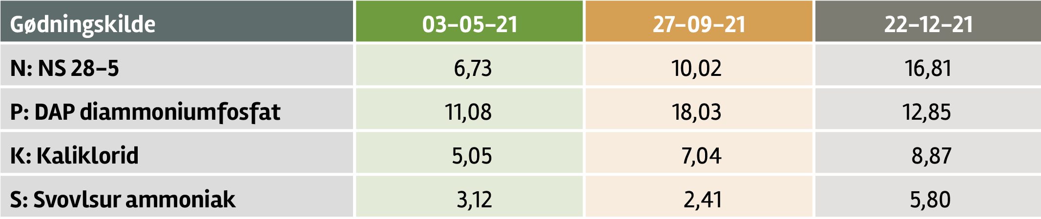 Det skal sammenlignes med 3.625 kr./ha som vist tidligere ved fuldgødskning med NKP 21-3-10. Der er dermed sparet 2.775 kr./ha ved at anvende gyllen. Det giver gyllen en gødningsværdi på 68 kr./ton og dermed retten til betegnelsen ”gylle er guld” med de nuværende gødningspriser.