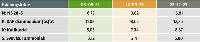 Tabel 2: Netto afgrødeværdi efter gødningsomkostninger høst 2022 baseret på aktuelle kontrakttilbud *) 725 kg NPK 21-3-10 á 5,00 kr./kg **) 100 kg NS 26 14 á 5,00 kr. placeret + nedfældning af 35 tons gylle á 20 kr. ***) 400 kg PK 0-4-21 á 3,00 kr./kg