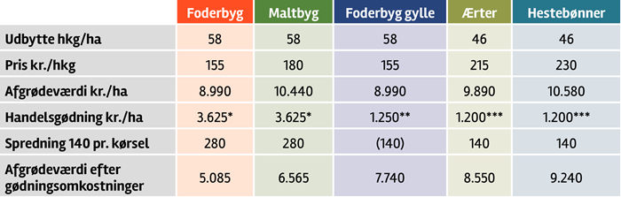 Da man i øjeblikket iflg. Kornbasen kan afhænde sin 2022-høst kontraktlig til 155 kr./hkg for foderbyg og 180 kr./hkg for maltbyg, svarer det til henholdsvis 8.990 kr. og 10.440 kr./ha ved et normudbytte på 58 hkg/ha på vandet sandjord JB 1-4. Vælger man ærter eller hestebønner med et udbytteniveau på 46 hkg/ha til en forventet salgspris på henholdsvis 215 og 230 kr./hkg, giver det en salgsværdi på henholdsvis 9.890 og 10.580 kr./ha. 0g dertil altså en sparet gødningsomkostning på 2,425 kr./ha.