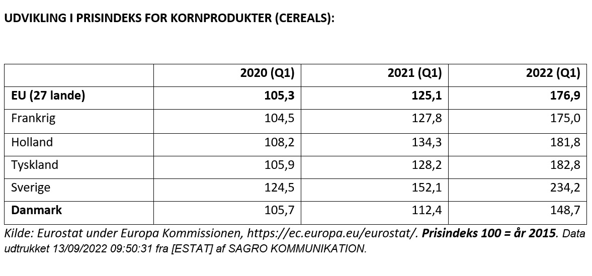 Prisindekset på "cereals", det vil sige kornprodukter, er i første kvartal af 2022 for hele EU på 176,9, set i forhold til 2015, som er sat til indeks 100. I Danmark er tallet 148,7. Det er der selvfølgelig flere årsager til.