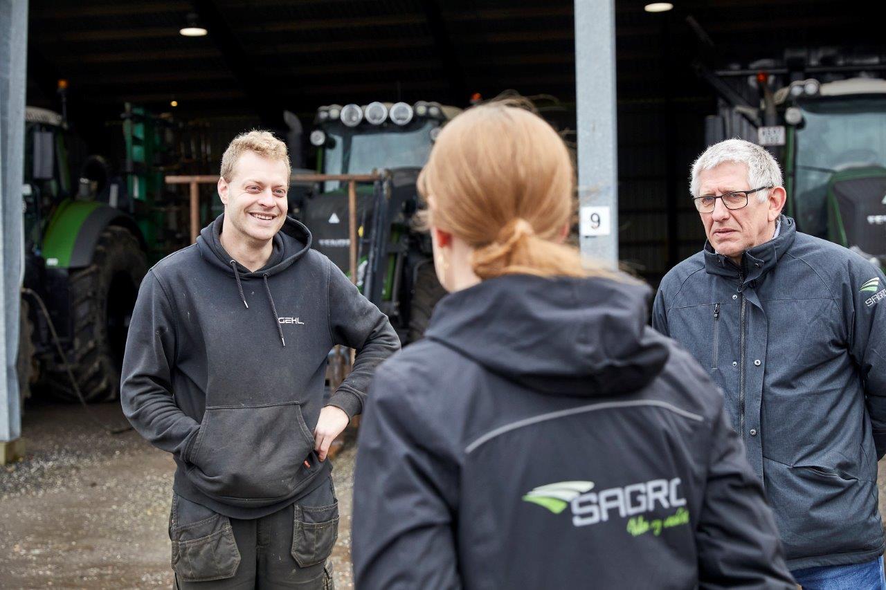 Vivi Ernstsen (med ryggen til) er den, der i sæsonen dagligt vil være i kontakt med Mikkel Olesen (tv,), der er Rostgård Maskinstations tovholder på samtlige opgaver på det store jordbrug. Til højre er det Erik Helbo Bjergmark.