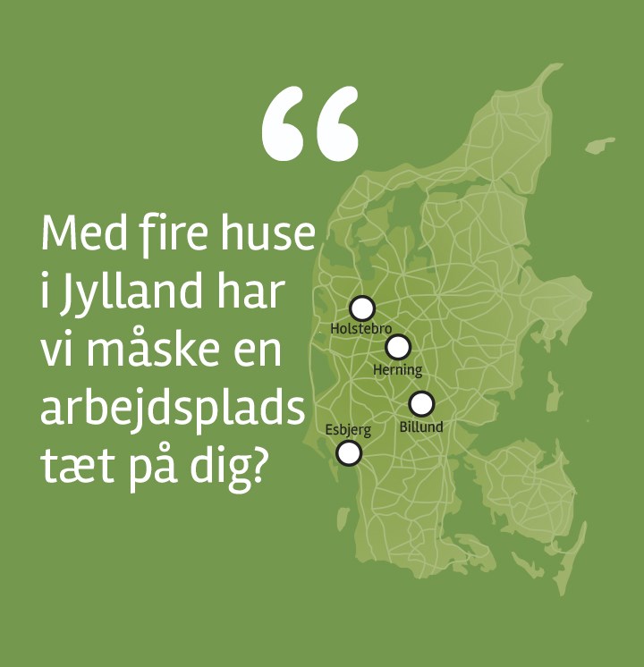Ved de fleste af de aktuelle stillinger bestemmer man selv, om man vil arbejde ud fra vores hus i enten Esbjerg, Billund, Herning eller Holstebro.