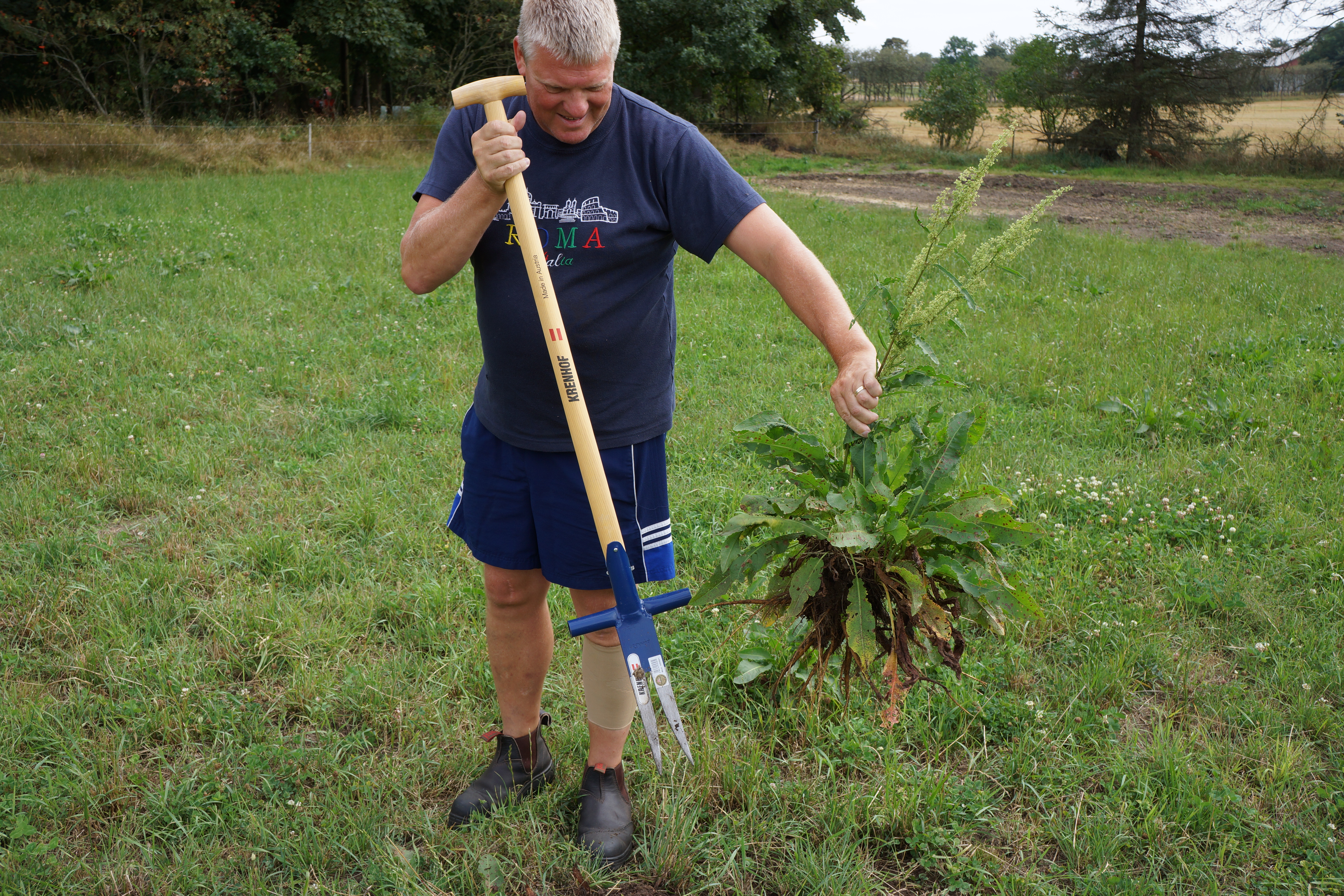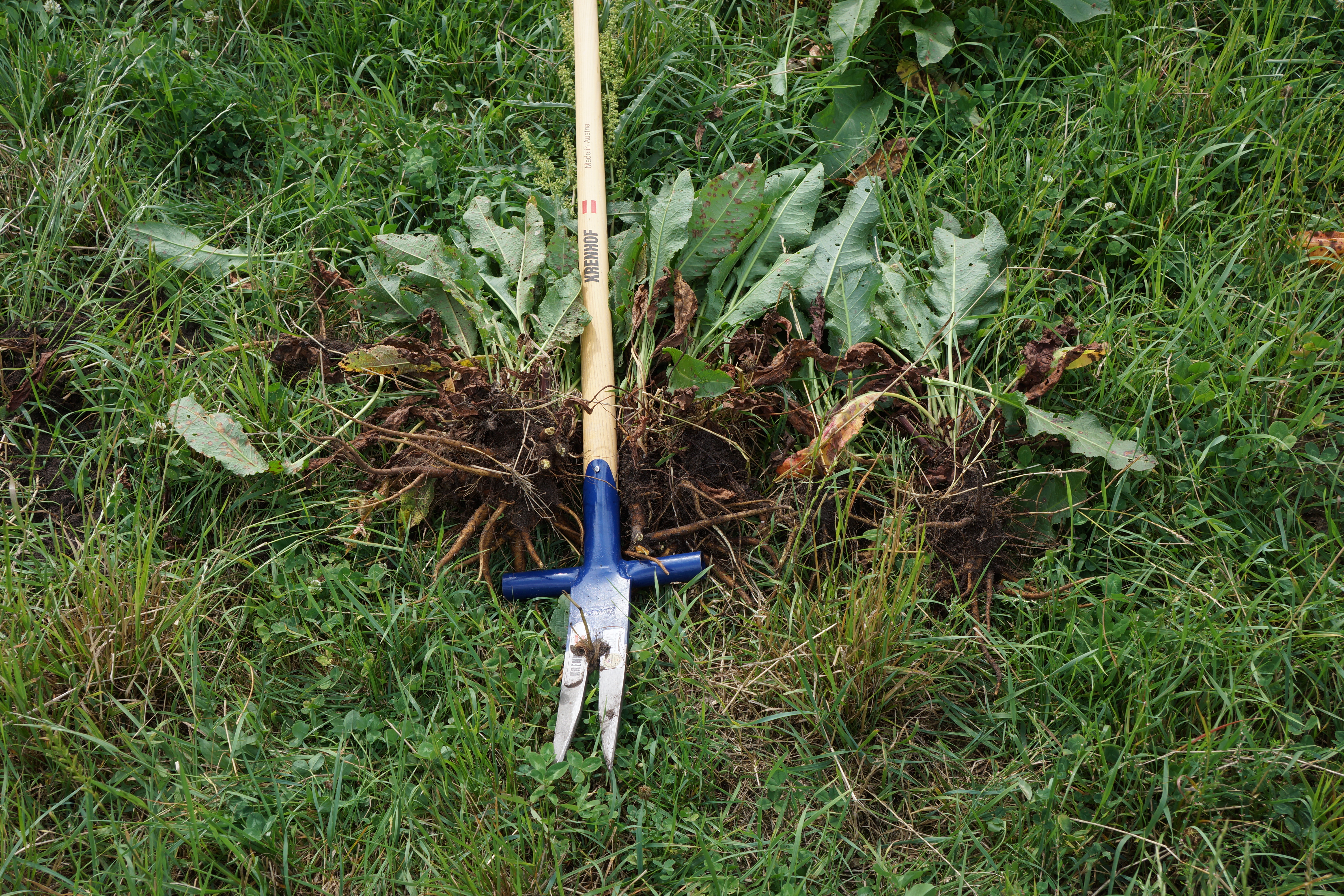 Det vil sige, at du skal fjerne dem, mens det stadig er overkommeligt, og så snart de viser sig. Her er skræppejernet en god makker, da det med sine 2 skarpe tænder kan begå sig selv over for store skræpper i græsmarker. Hvis du ikke kan få hele planten op, er det nok med de øverste 10 cm, da det er her fra, den kan skyde igen.