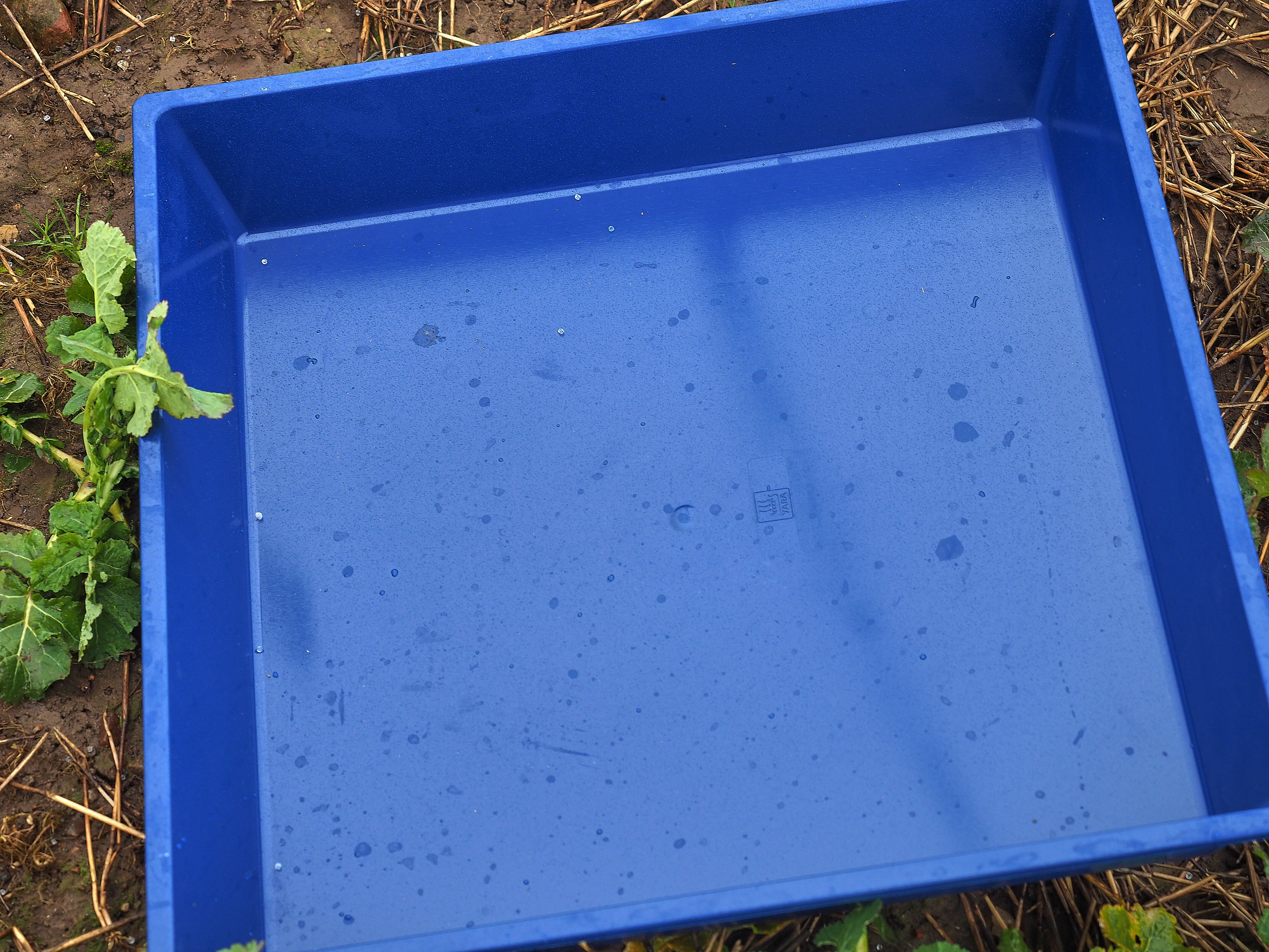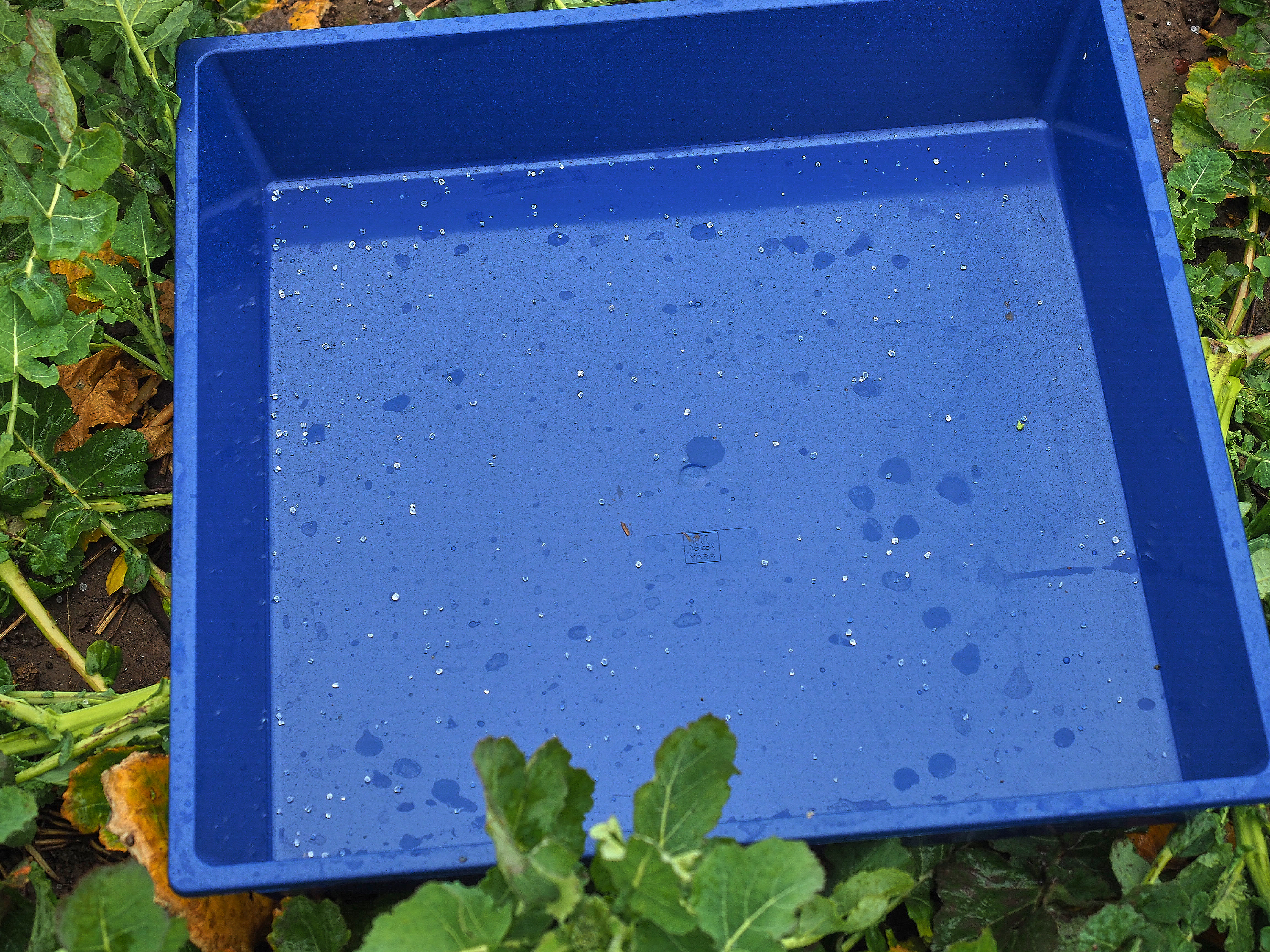 Vejrliget gjorde det nødvendigt hurtigt at indsamle spredebakkerne, efter at gødningsspreder havde passeret testarealet, for at undgå at gødningskornene blev opløst. I testen er mængderne ikke vejet, men kun vist illustrativt.