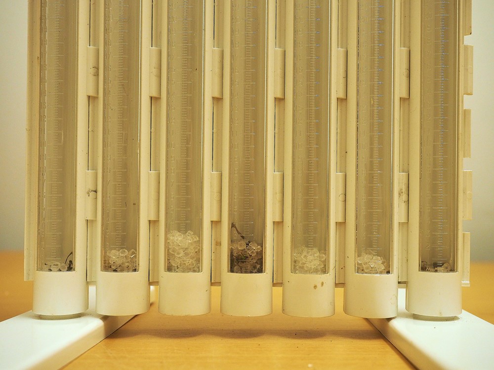 Søjlen i prøveglasset i midten er mængden lige under gødningssprederen. Ud fra midten, til begge sider, er testen taget hhv. 4, 8 og 12 m fra midten.