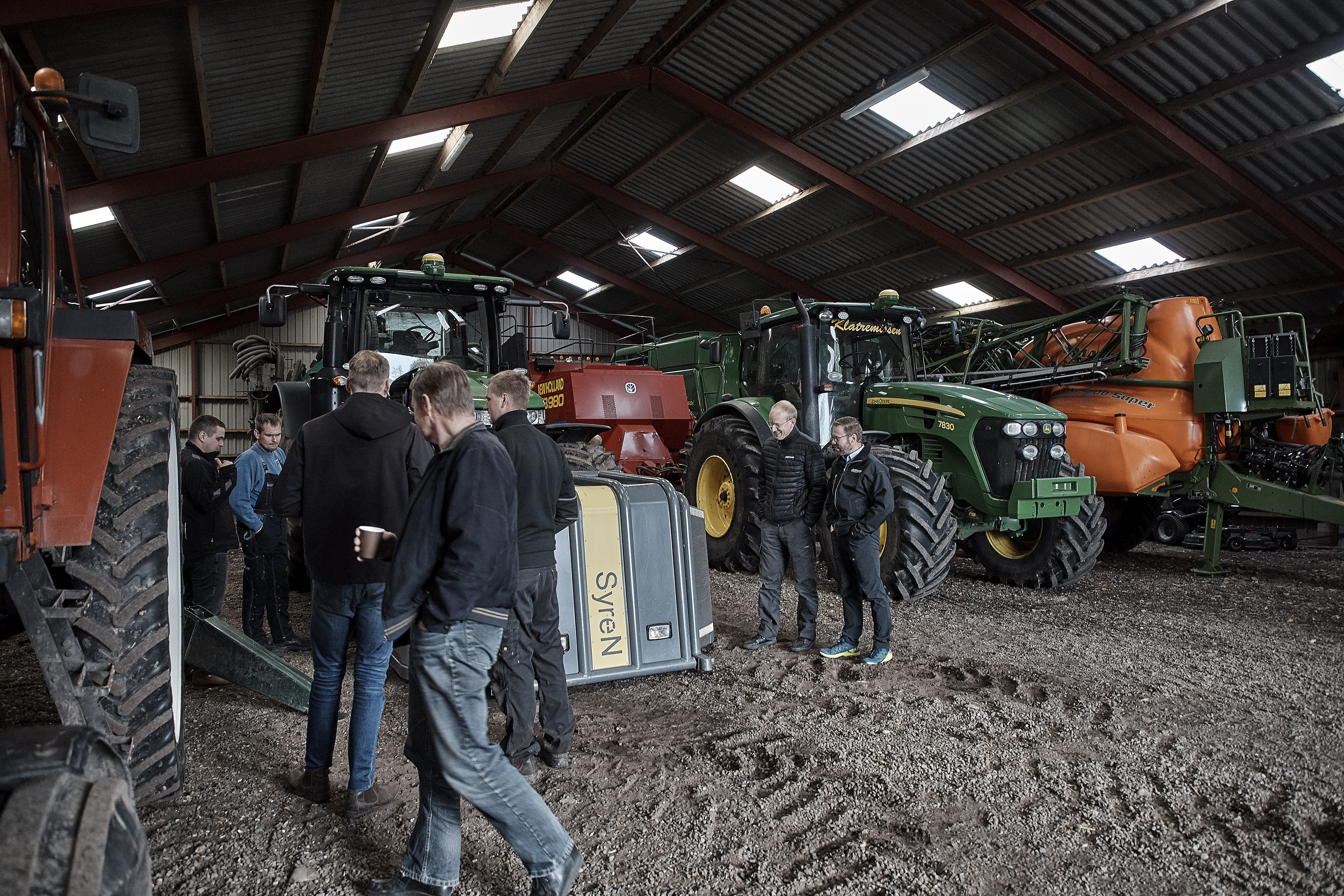 Omkring 50 landmænd, rådgivere og teknikere kom for at blive klogere på muligheder og udfordringer i præcisionsjordbrug. I Anders Rahbeks maskinhus står redskaberne - alle med computerteknik og gps.