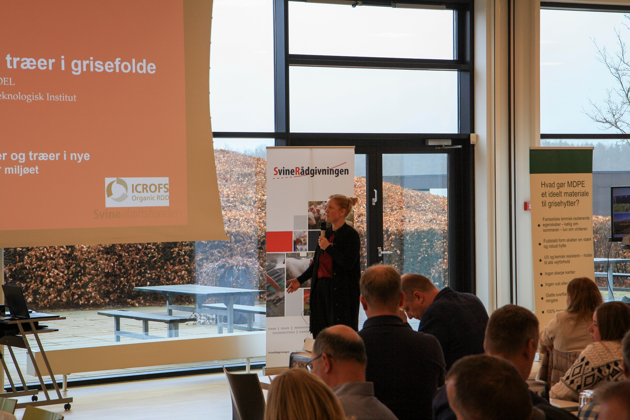 Rikke Thomsen og Helle Hestbjerg fra henholdsvis ICOEL og Teknologisk Institut indtager nu scenen og fortæller om OUTFIT-projektet og om værdien af træer i grisefolde. De gør nemlig stor nytte i en griseproduktion.