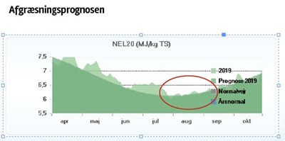 Til hjælp for at kende udviklingen i græssets værdi er det klogt at benytte afgræsningsprognosen (se figur til højre), som forudsiger græssets fordøjelighed, målt på MJ/kg ts. Hvis der tages udgangspunkt i ydelseskurve (se figur til venstre) og afgræsningsgræssets kvalitet, er der en sammenhæng.