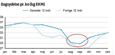 Varme, over 23-25 ˚C, er ikke græsvejr. Kombineres det med tørke, vil det i udpræget grad forringe græskvaliteten, så køerne ikke har den store ædelyst, og kvaliteten vil typisk forringes betydeligt. Kombineres disse forhold med en høj luftfugtighed, vil det i den grad udfordre køerne. Resultatet kan være som nedenstående kurve for mælkeydelsen pr. ko.