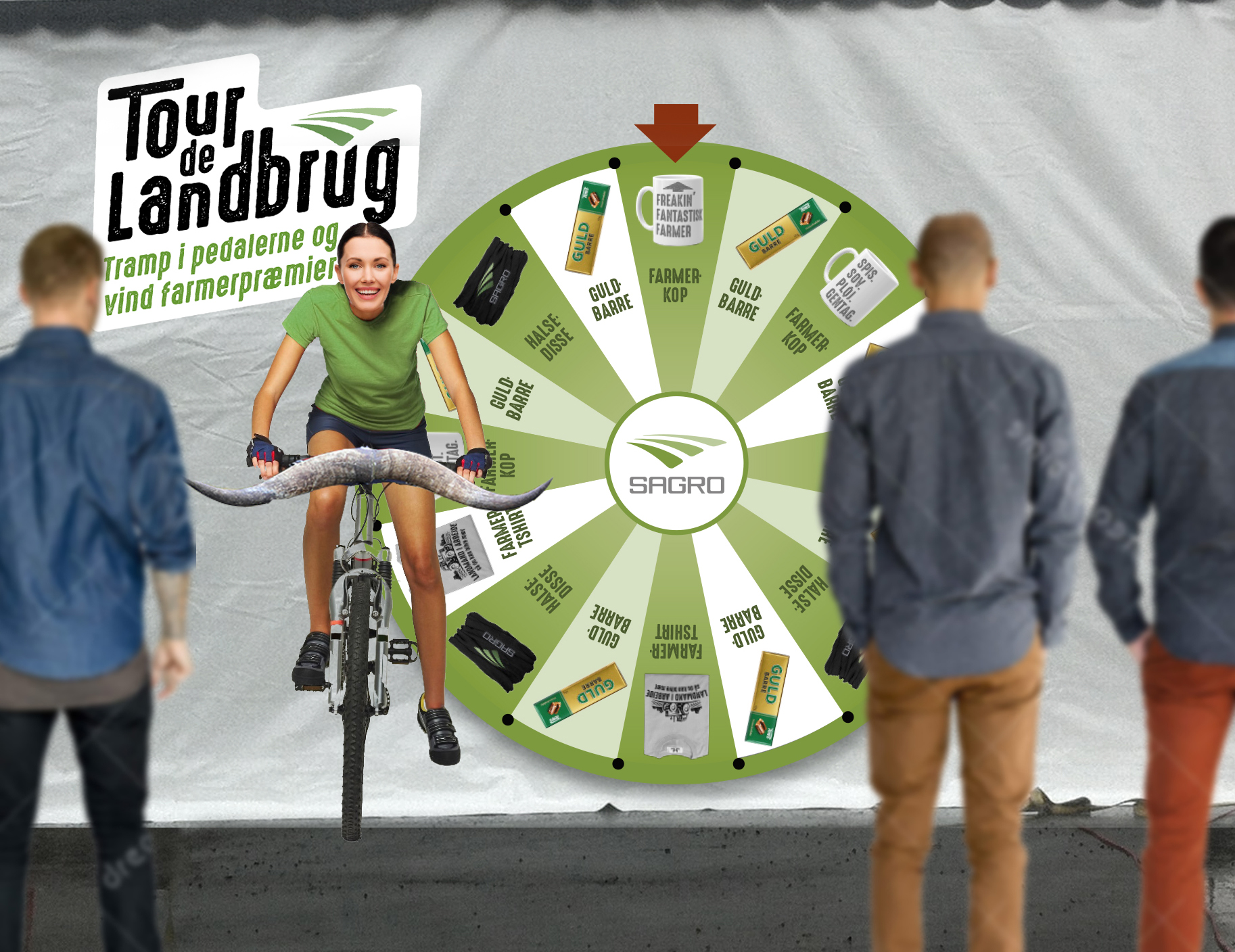 Landsskuet finder sted mens der køres Tour de France-etaper i Danmark. I SAGROs telt kan du deltage i Tour de Landbrug, hvor du skal cykle 1 km – og gerne i konkurrence mod én du kender. Med din deltagelse sætter du samtidig SAGROs store lykkehjul i bevægelse. Her er der præmier, som kan bruges af alle der bor på landet.