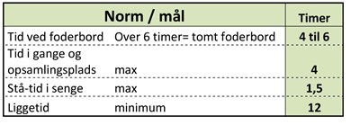Mere end 4 timer ved foderbordet er ikke optimalt og skyldes ofte tomt foderbord/manglende indfejninger, overbelægning, reduceret foderbord og TMR-rationer med mulighed for sortering .